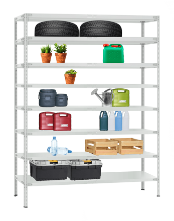Полки стеллажей имеют стандартные размеры и могут крепиться к вертикальным стойкам с регулировкой по высоте. Разная высота стоек позволяет в сочетании с использование широкого выбора полок собирать стеллажи необходимых размеров и конфигураций. Конструкция позволяет быстро изменять высоту полок